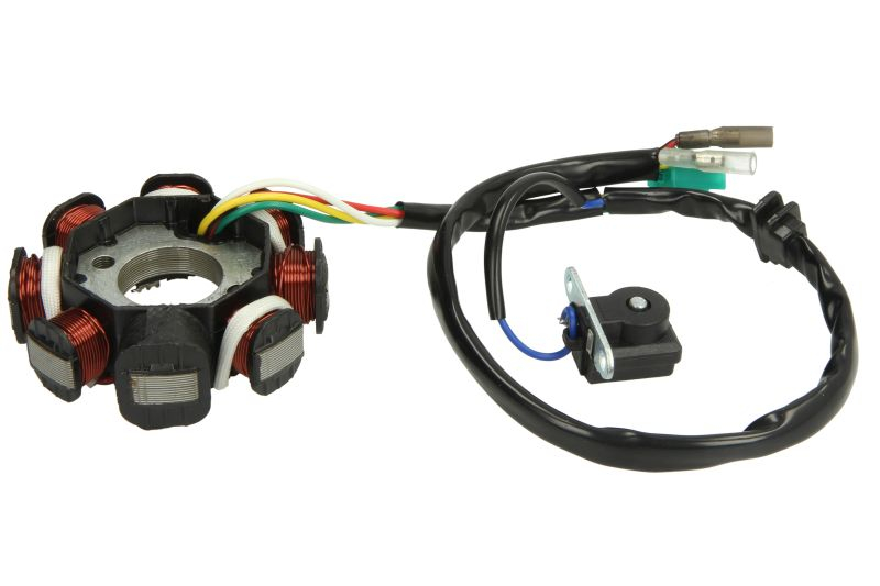 Statorul de alternator INPARTS IP000501 este compatibil cu motoarele GY6 125 și GY6 150 (4T), utilizate pe scutere, mopede, motorowere și ATV‑uri chinezești. Echipat cu 8 bobine (8 poli) și 5 fire, acest stator include și generator de impuls (pickup), asigurând o încărcare stabilă a bateriei și o funcționare corectă a sistemului de aprindere.